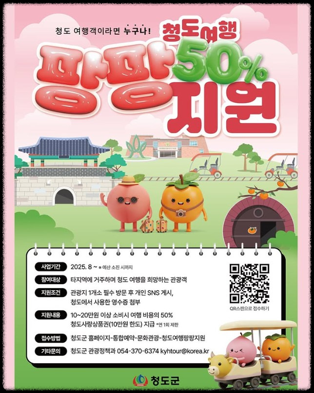 - 청도여행 팡팡 지원사업은 2025년 12월까지 신청 가능합니다.