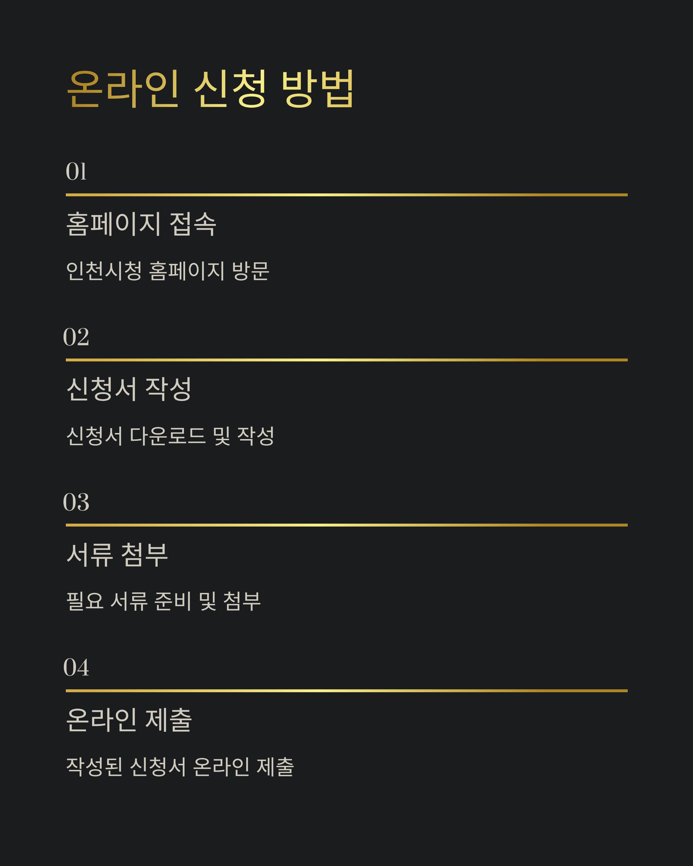 온라인 또는 오프라인으로 신청할 수 있으며, 인천시청 홈페이지에서 신청서를 다운로드하여 제출하면 됩니다.