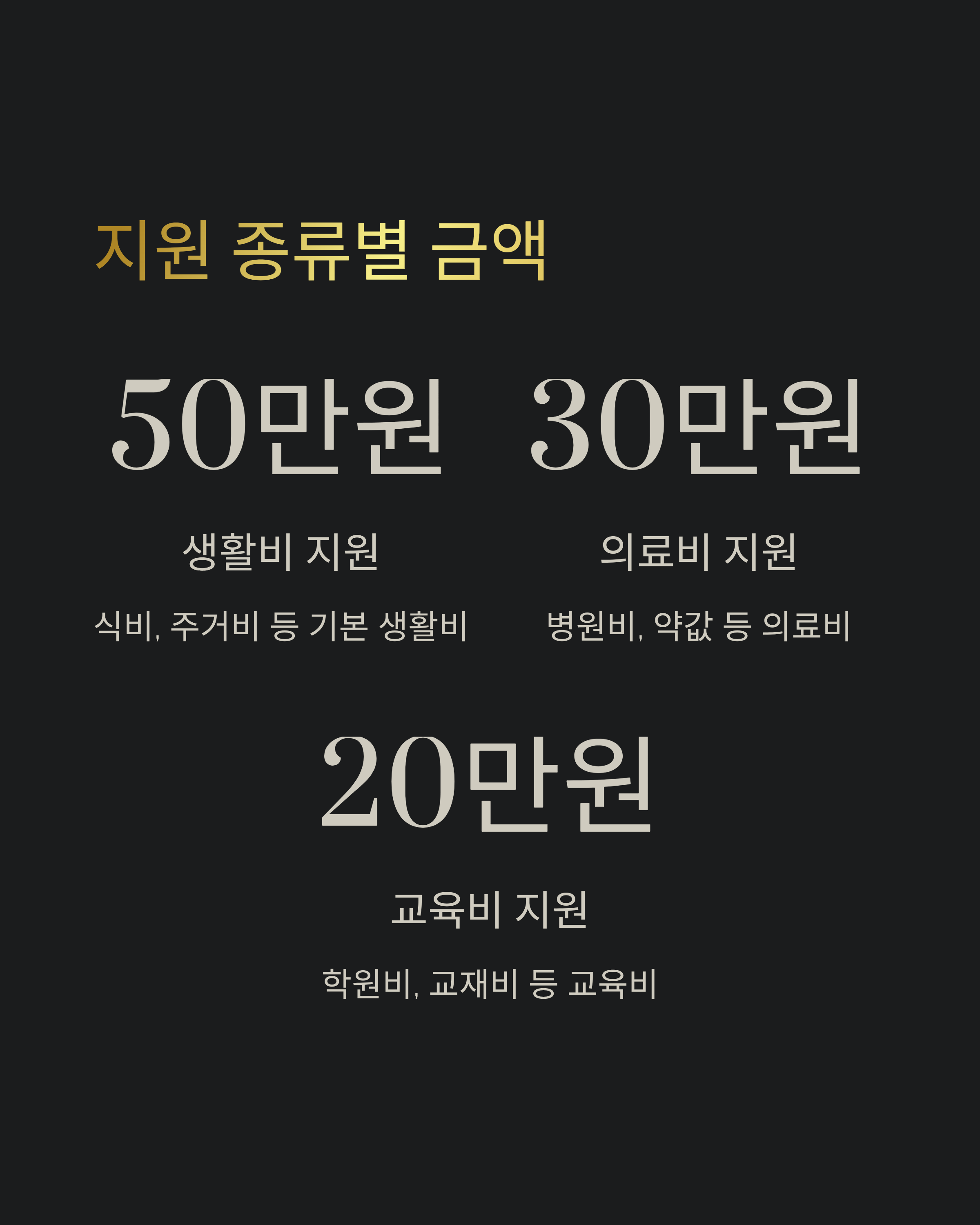 | 생활비 지원 | 저소득층 가구 | 최대 50만원 |